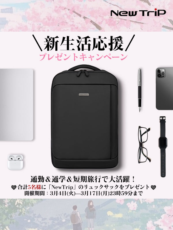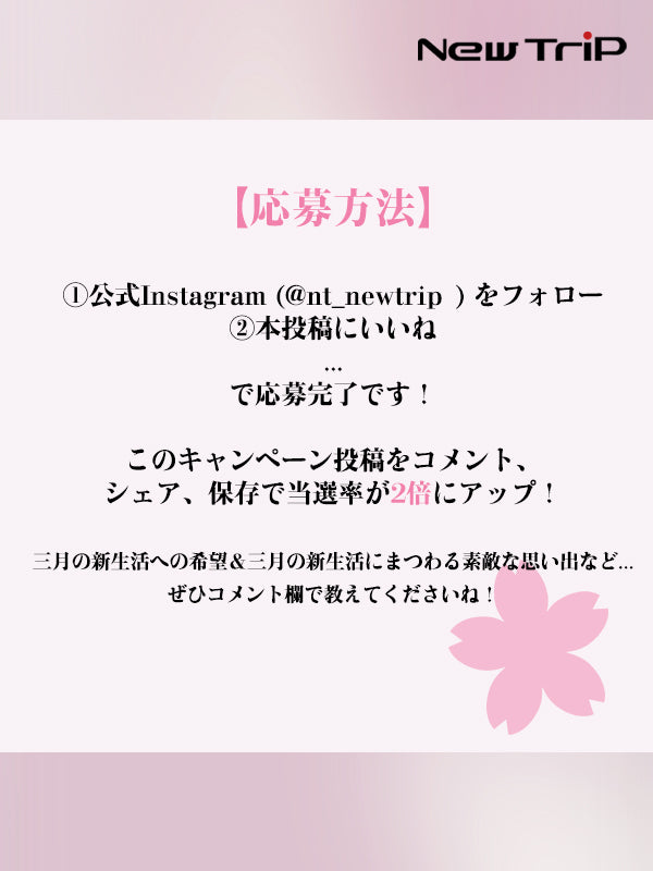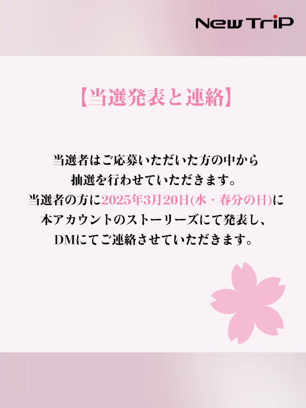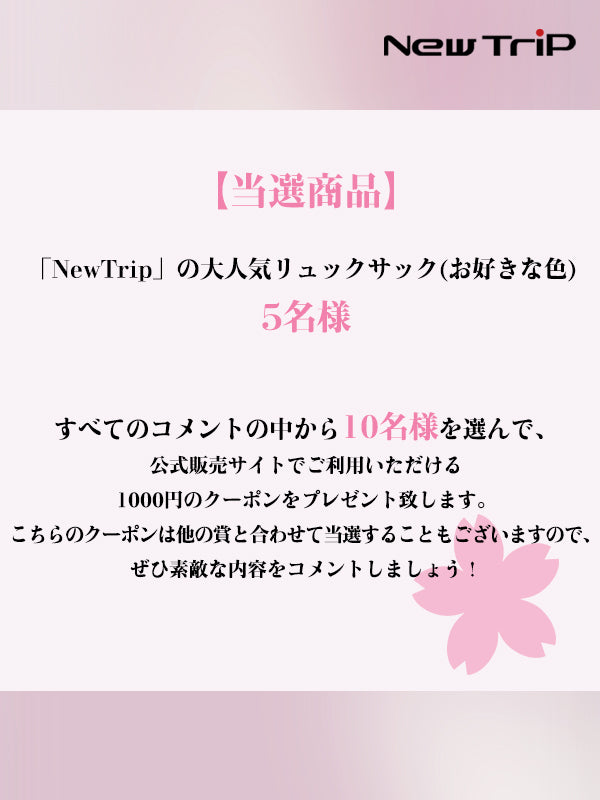 · 당첨 상품 :NewTrip 대인기 배낭( 색 선택 가능 )5 명 → 통학 도 외출도 , 이것 하나로 세련되게 정해진다! · 특별 선물 :코멘트 채용자10 명에게1000 엔 쿠폰 ・응모 기간:2025년 3월 4일 (화)~ 3월 17일 (월) 23:59 까지 당선 발표는 3월 20일 (수·춘분의 날)에 스토리즈로 공개 예정. 당첨자에게는 DM으로 연락이 가므 로, 팔로우한 채로 기다려 주세요!