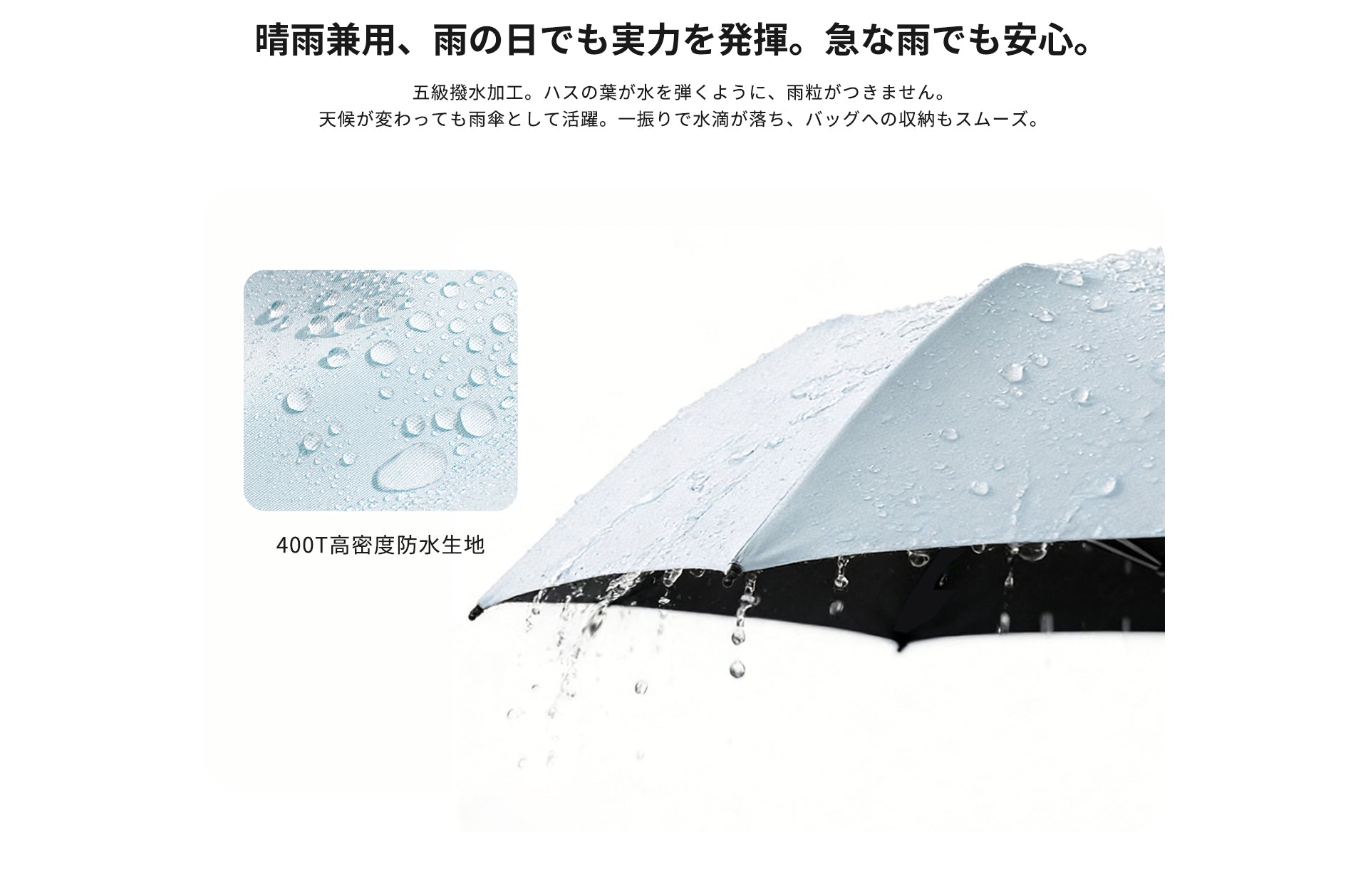 세세하게 짜 올린 고밀도 천이 비를 확실히 튀어, 뛰어난 방수 성능을 발휘.장시간의 비에서도 안쪽에 스며들기 어렵고, 쾌적하게 사용할 수 있습니다.