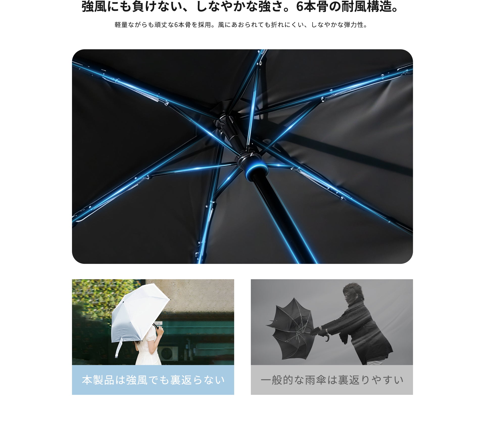 가볍고 유연한 알루미늄 합금 + 유리 섬유 소재를 사용하여 강한 바람에도 지지 않는 8 개 구조로 제대로 우산을지지합니다.