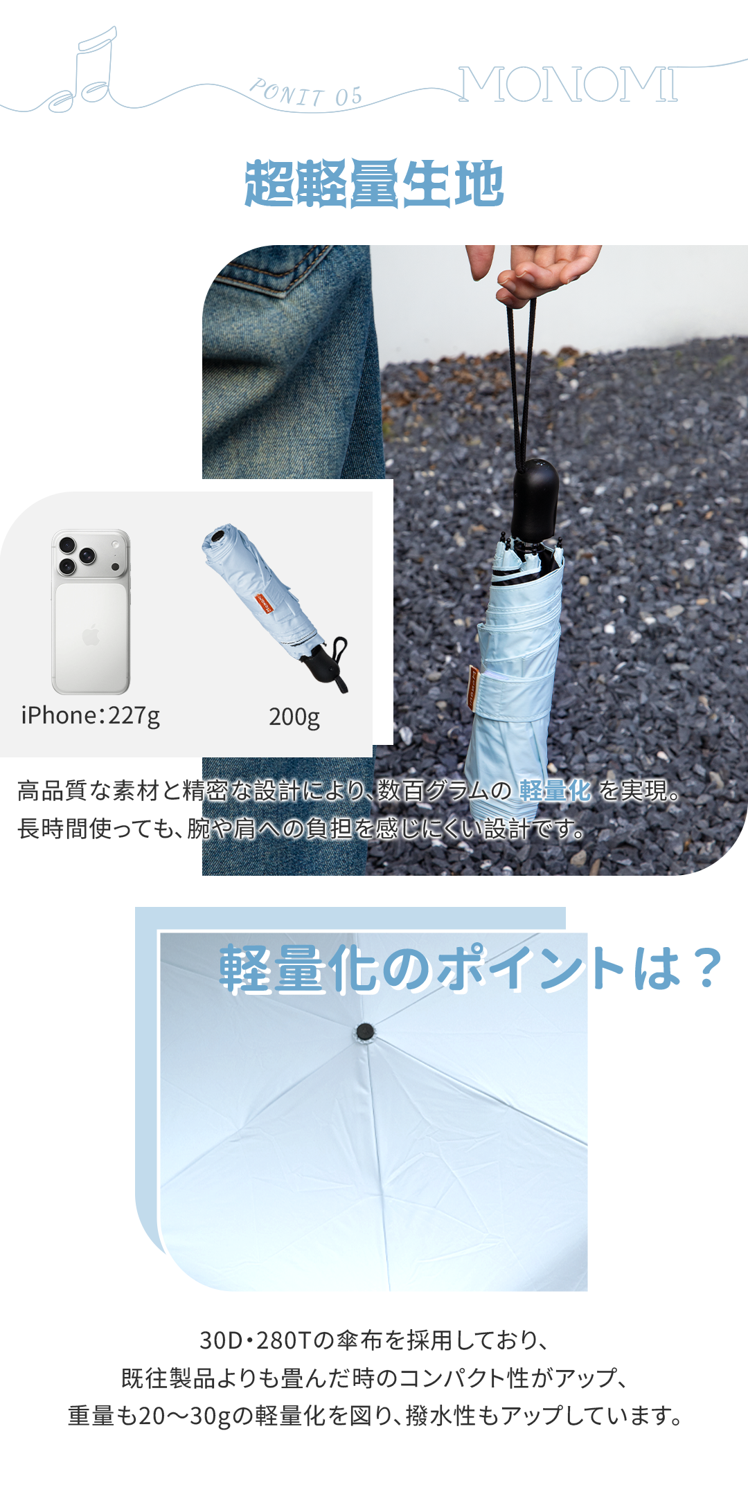 6本骨の自動開閉モデルでありながら、重量はわずか200g前後と圧倒的な軽さを実現しました 。