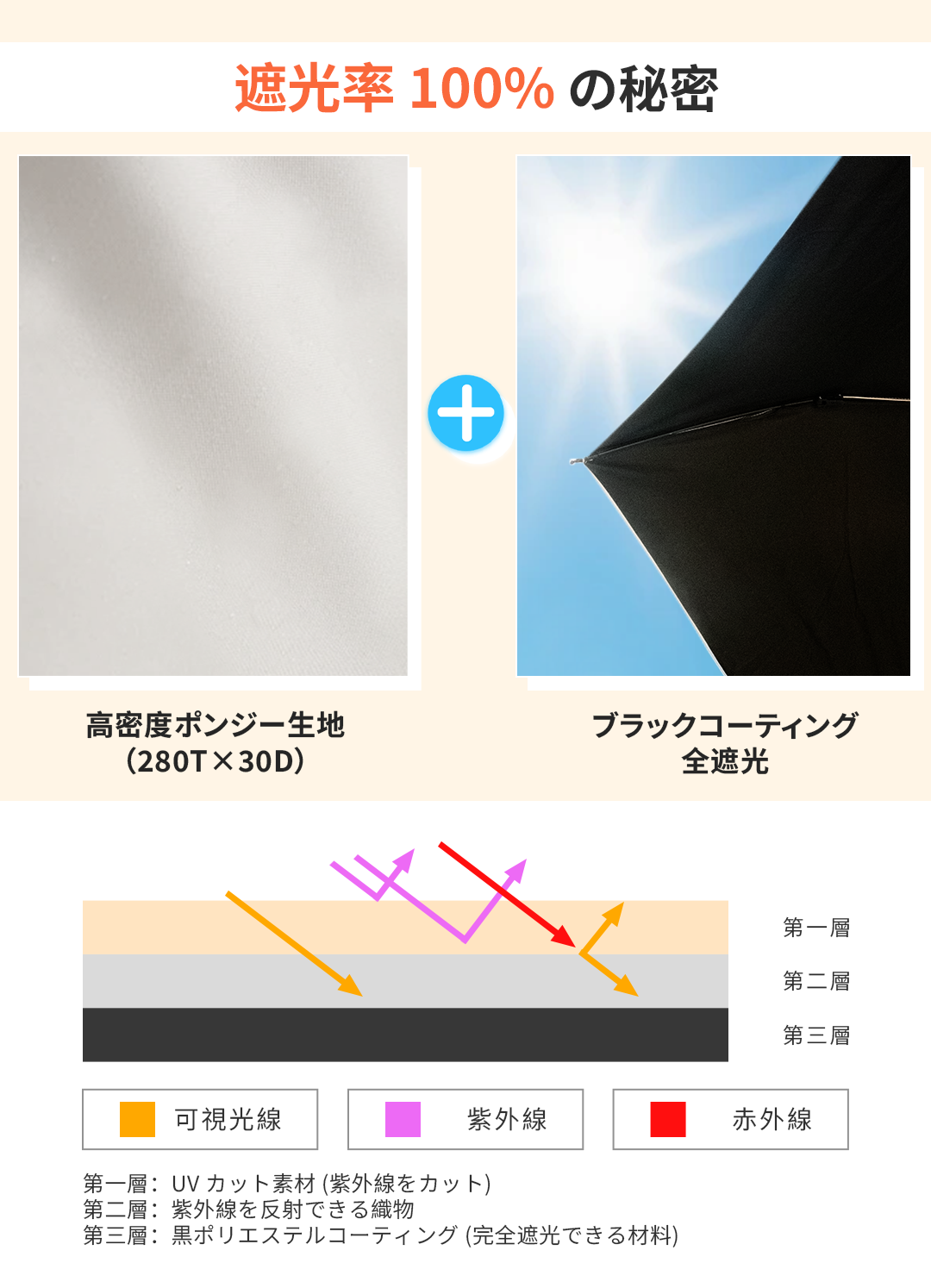 紫外線カット率100%・UPF50+を達成し、物理的に太陽光を遮断することで高い遮熱効果を発揮します 。